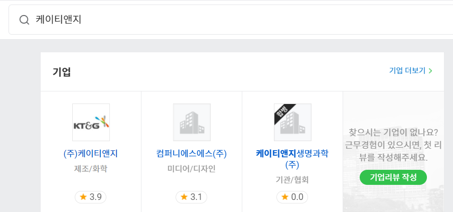 일단 예를들어 저같은 경우에는 kt&g를 검색하였습니다. 이후 해당 기업의 리뷰를 봐야하는데 이 리뷰를 보는 방법에는